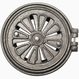 Udsmykket ventil med drejeligt spjæld. Ved at dreje ventilen for at åbne og lukke spjældene reguleres ventilationen. Modellen har været anvendt fra 1800-tallet og frem til 1920'erne. Ventilen fastgøres med puds eller gipsmørtel i pudsede vægge. På vægge af plademateriale kan du i stedet montere med lim eller skum. Bemærk, at ventilen skal rustbeskyttes, da den sorte lak på støbejernsventilen ikke fungerer som rustbeskyttelse. Produceret af og for Byggfabriken, sælges eksklusivt hos Byggfabriken.