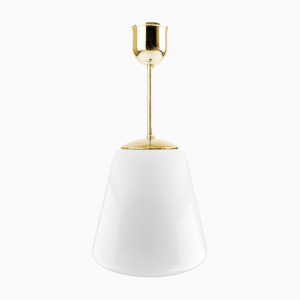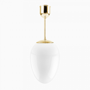 Tidløs kuglelampe med pendel i poleret messing och kugle i opalhvidt glas. Den rene messingoverflade og det hvide glas giver et blødt og behageligt udtryk. Den spreder et jævnt lys og fungerer lige godt alene som i en række over et bord eller i en gang.