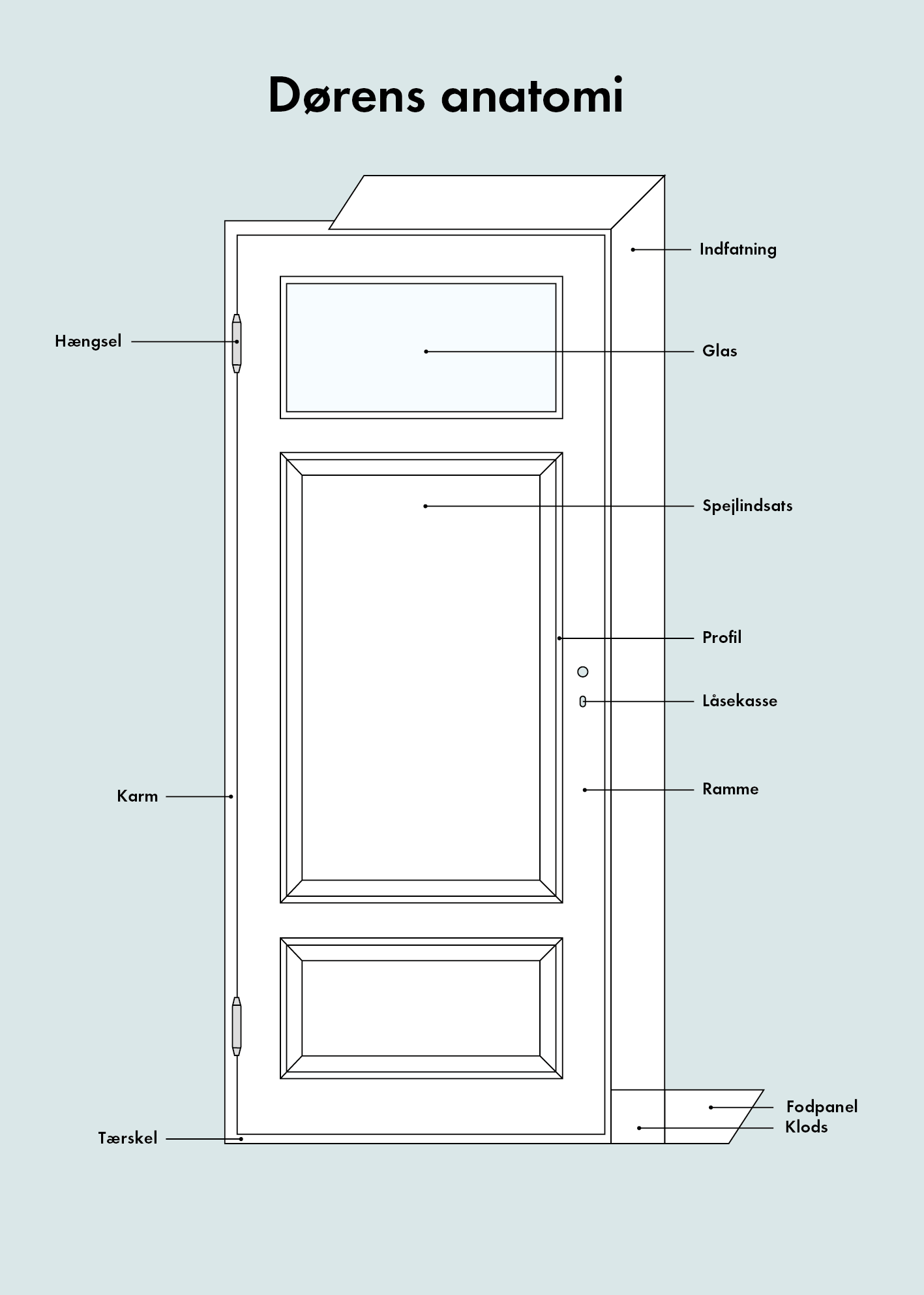 Fyldningsdørens forskellige dele har forskellige navne. Når du skal bestille en dør, kan det være en fordel at vide, hvad der er hvad, så din dør bliver præcis, som du ønsker den. Man kunne kalde det en slags dørens anatomi.